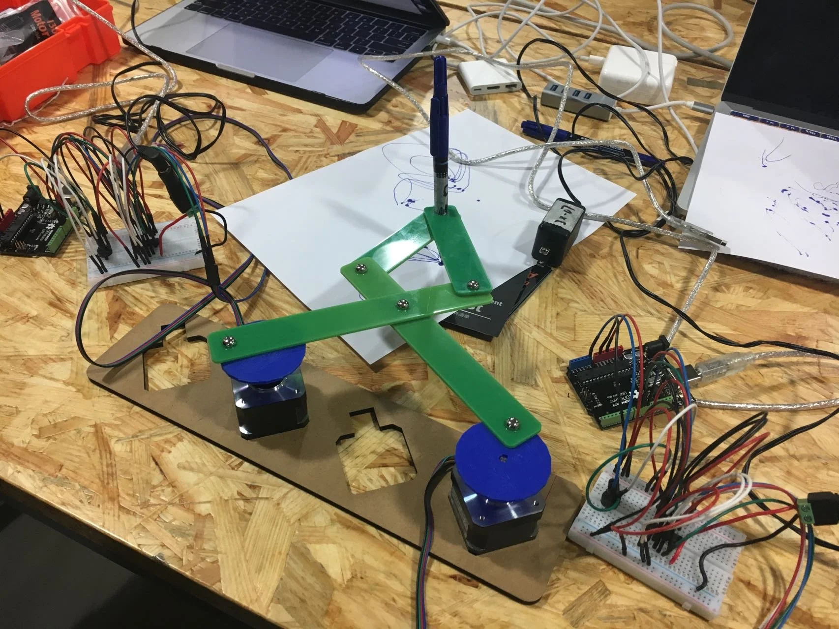 Once I’ve narrowed down the design challenge to controlling the distance between points using a stepper motor, I had an idea. One of the exercises we did when learning Arduino was using two stepper motors to create a drawing machine (image on the left). By attaching the same two 3D-printed caps to the motor, we could then control the distance between the two points on the cap by simply rotating the motor.