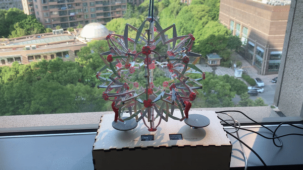Bloom is a kinetic installation, a documentation of new lives created in Chinese contemporary history. Controlled by two motors, the Hoberman Sphere will expand and contract as a response to the received data on the number of births per year in China from 1949 to 2019, visualizing the change of increased population since the proclamation of the People's Republic of China.