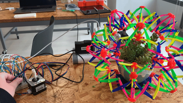 Made with: Hardware - Arduino, Hoberman Sphere, Cardboard; Software - Node-RED, Tinkercad, Illustrator; Materials - Cardboard, Fishing Wire, Spray Paint.